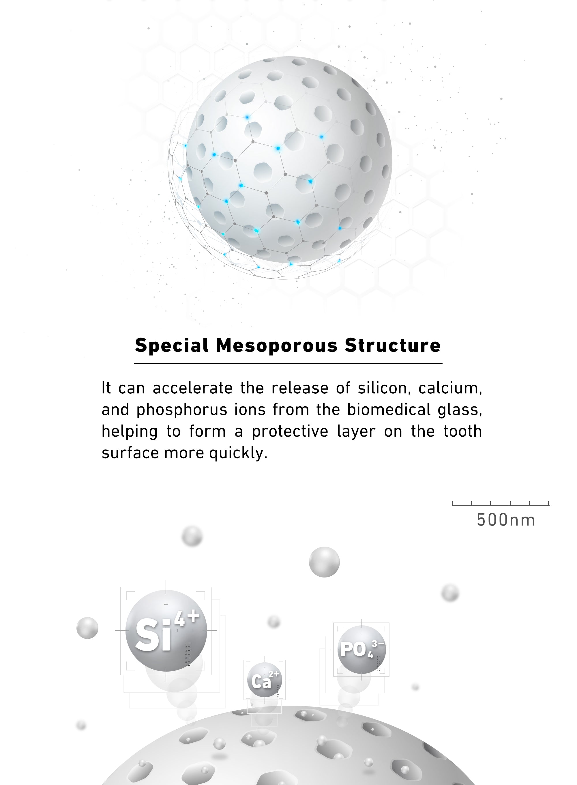 MesoFill is a compound containing silicon, calcium, and phosphorus ions, which closely resemble the components found in human teeth and bones. Its unique amorphous nature enhances the biocompatibility of the glass compound, facilitating the release of silicon, calcium, and phosphorus ions at a controlled rate. This aids in the faster formation of hydroxyapatite (the main component of teeth and bones) protective layers, promoting the repair of teeth and bones.